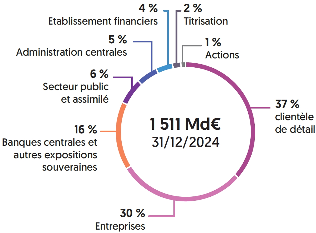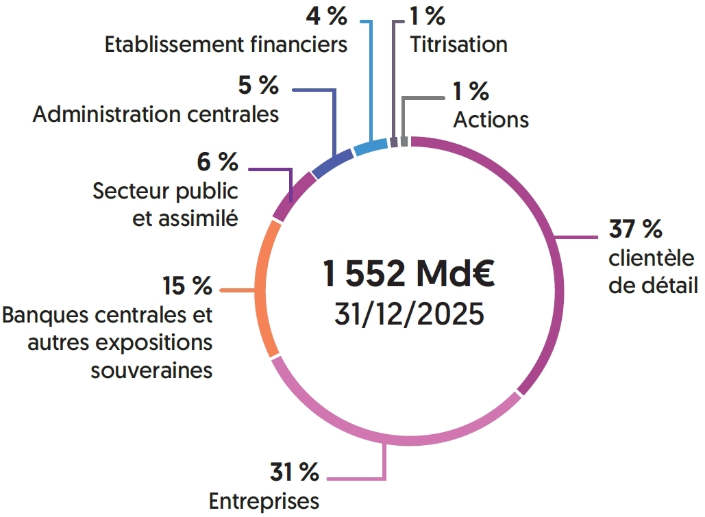 Au 31 décembre 2025, l’exposition brute au risque de crédit s’élève à 1 552 milliards d’euros, avec la répartition suivante : 37 % auprès de la clientèle de détail, 31 % auprès des entreprises, 15 % auprès des banques centrales et expositions souveraines, 6 % dans le secteur public et assimilé. Les risques pondérés au titre du risque crédit s’élèvent à 391 milliards d’euros (incluant le risque de contrepartie). Pour le portefeuille des Entreprises non financières, les secteurs principaux sont Immobilier (37 % des expositions brutes), Commerce (11 %), Finance/Assurance (10 %) et Activités spécialisées, scientifiques et techniques (7 %).