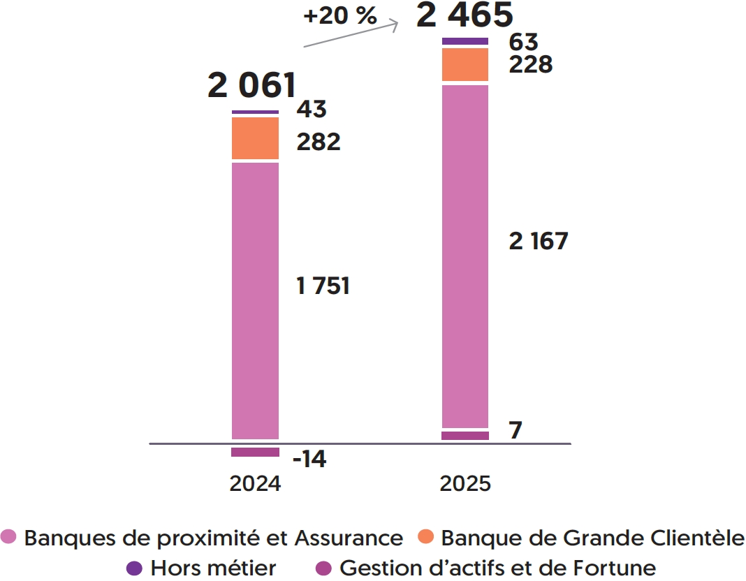 Pour l’année 2025, le total net des commissions s’élève à 11 258 millions d’euros, soit 44 % du produit net bancaire du Groupe BPCE.