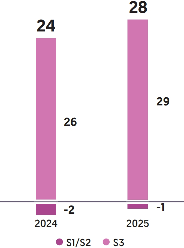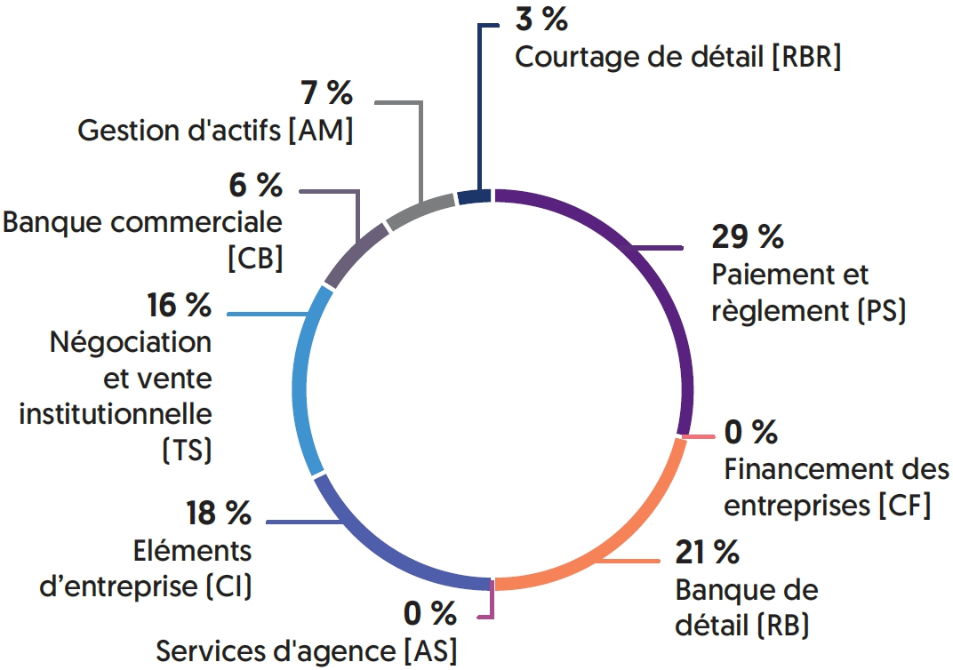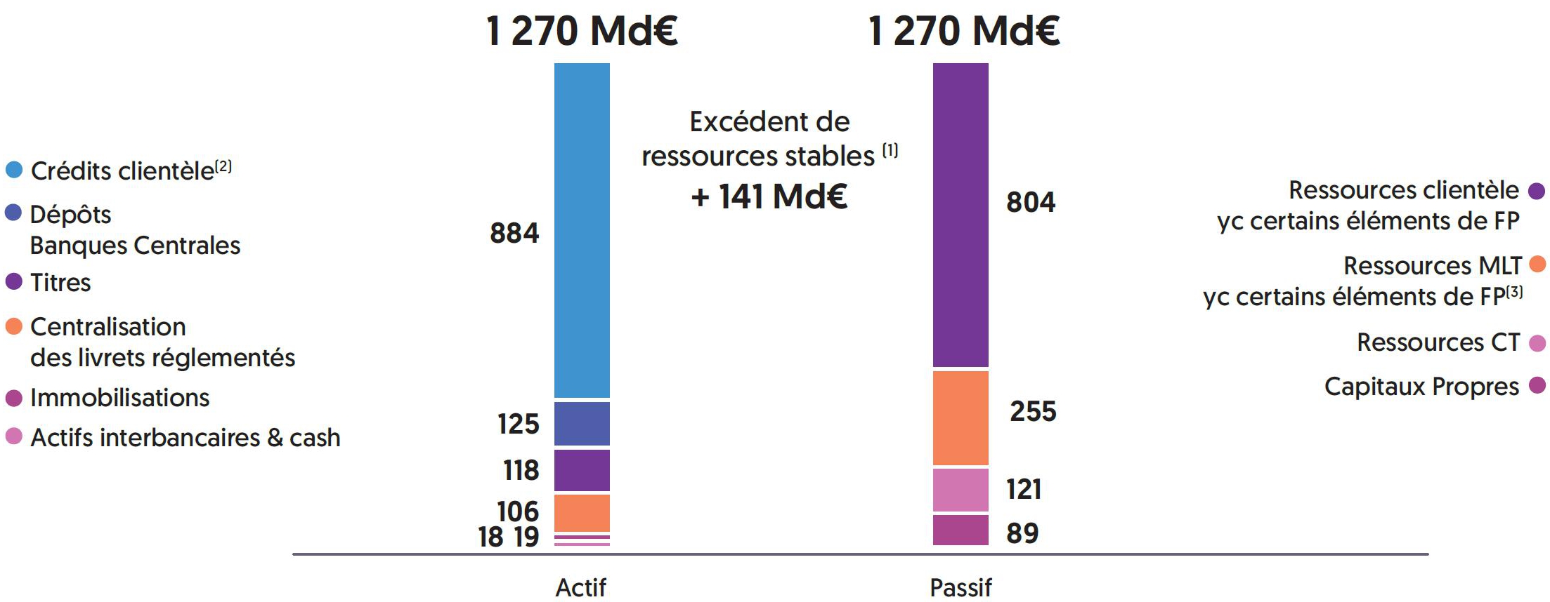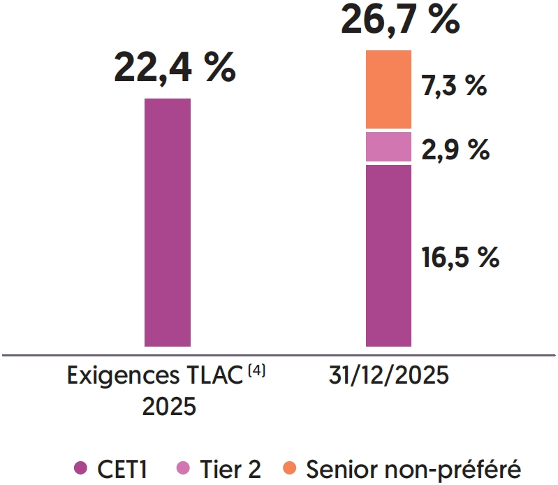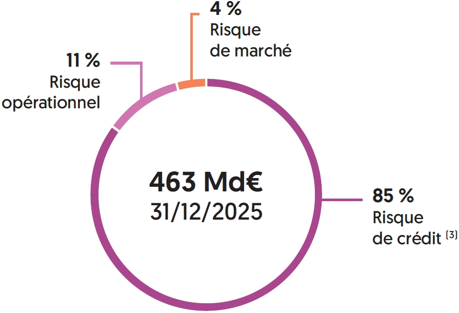 Pour information, le coût du risque s’établit à – 2 465 millions d’euros en 2025 contre – 2 061 millions en 2024, les risques de crédit représentant 84 % des risques pondérés du groupe. Sur les expositions brutes, 37 % concernent la clientèle de détail et 31 % la clientèle d’entreprises (dont 65 % des expositions se situent en France).