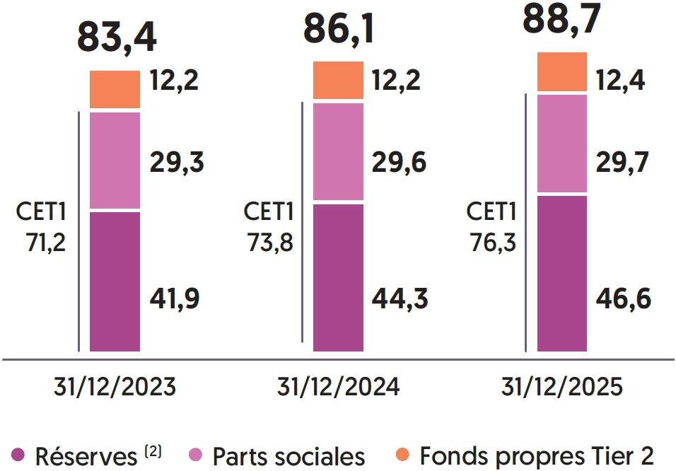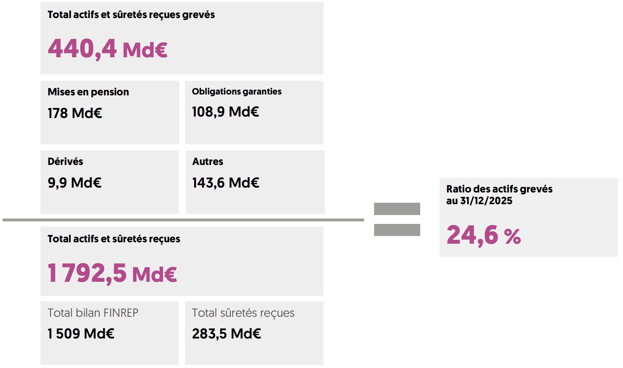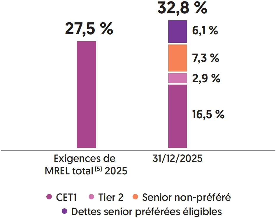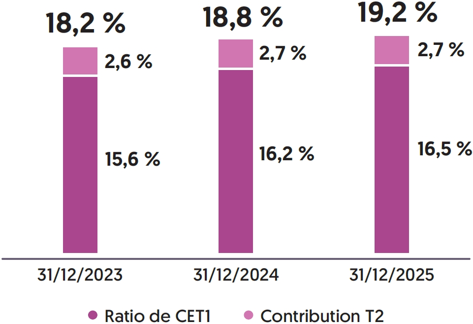 Indicateurs complémentaires 31/12/2025 31/12/2024 Coût du risque (en points de base) 28 24 Taux d’encours douteux/Encours bruts 2,7 % 2,5 % Dépréciations constituées/Encours bruts 39,4 % 39,9 % VaR consolidée du Groupe BPCE (en millions d’euros) 7,3 7,9 Réserves de liquidité (en milliards d’euros) 305 302 a b c d e En millions d’euros 31/12/2025 30/09/2025 30/06/2025 31/03/2025 31/12/2024 Fonds propres disponibles 1 Fonds propres de base de catégorie 1 (CET1) 76 310 74 641 73 709 73 223 73 847 2 Fonds propres de catégorie 1 76 310 74 641 73 709 73 223 73 847 3 Fonds propres totaux 88 757 87 100 86 391 86 835 86 057 Risques pondérés 4 Montant total des risques pondérés 463 054 455 029 451 854 451 453 456 591 4a Exposition totale avant floor 463 054 455 029 451 854 451 453 - Ratios de fonds propres (en pourcentage des risques pondérés) 5 Ratio de fonds propres de base de catégorie 1 16,48 % 16,40 % 16,31 % 16,22 % 16,17 % 5b Ratio de fonds propres de base catégorie 1 par rapport au TREA sans application du plancher (%) 16,48 % 16,40 % 16,31 % 16,22 % 0,00 % 6 Ratio de fonds propres de catégorie 1 16,48 % 16,40 % 16,31 % 16,22 % 16,17 % 6b Ratio de fonds propres catégorie 1 par rapport au TREA sans application du plancher (%) 16,48 % 16,40 % 16,31 % 16,22 % 0,00 % 7 Ratio de fonds propres totaux 19,17 % 19,14 % 19,12 % 19,23 % 18,85 % 7b Ratio de fonds propres totaux non flooré 19,17 % 19,14 % 19,12 % 19,23 % 0,00 % Exigences de fonds propres supplémentaires pour faire face aux risques autres que le risque de levier excessif (en pourcentage des risques pondérés) EU 7d Exigences de fonds propres supplémentaires pour faire face aux risques autres que le risque de levier excessif (%) 2,25 % 2,25 % 2,25 % 2,25 % 2,10 % EU 7e dont : à satisfaire avec des fonds propres CET1 (points de pourcentage) 1,27 % 1,27 % 1,27 % 1,27 % 1,18 % EU 7f dont : à satisfaire avec des fonds propres de catégorie 1 (points de pourcentage) 1,69 % 1,69 % 1,69 % 1,69 % 1,58 % EU 7g Exigences totales de fonds propres SREP (%) 10,25 % 10,25 % 10,25 % 10,25 % 10,10 % Exigence globale de coussin et exigence globale de fonds propres (en pourcentage des risques pondérés) 8 Coussin de conservation des fonds propres 2,50 % 2,50 % 2,50 % 2,50 % 2,50 % EU 8a Coussin de conservation découlant du risque macroprudentiel ou systémique constaté au niveau d’un État membre 0,00 % 0,00 % 0,00 % 0,00 % 0,00 % 9 Coussin de fonds propres contracyclique spécifique à l’établissement 0,90 % 0,90 % 0,90 % 0,90 % 0,90 % EU 9a Coussin pour le risque systémique 0,00 % 0,00 % 0,00 % 0,00 % 0,00 % 10 Coussin pour les établissements d’importance systémique mondiale 1,00 % 1,00 % 1,00 % 1,00 % 1,00 % EU 10a Coussin pour les autres établissements d’importance systémique 1,00 % 1,00 % 1,00 % 1,00 % 1,00 % 11 Exigence globale de coussin 4,40 % 4,40 % 4,40 % 4,40 % 4,40 % EU 11a Exigences globales de fonds propres 14,65 % 14,65 % 14,65 % 14,65 % 14,50 % 12 Fonds propres CET1 disponibles après le respect des exigences totales de fonds propres SREP 8,79 % 8,72 % 8,62 % 8,53 % 8,60 % Ratio de levier 13 Mesure de l’exposition totale 1 489 339 1 479 194 1 457 183 1 451 653 1 435 845 14 Ratio de levier 5,12 % 5,05 % 5,06 % 5,04 % 5,14 % Exigences de fonds propres supplémentaires pour faire face au risque de levier excessif (en pourcentage de la mesure de l’exposition totale) EU 14a Exigences de fonds propres supplémentaires pour faire face au risque de levier excessif 0,00 % 0,00 % 0,00 % 0,00 % 0,00 % EU 14b dont : à satisfaire avec des fonds propres CET1 0,00 % 0,00 % 0,00 % 0,00 % 0,00 % EU 14c Exigences de ratio de levier SREP totales 3,00 % 3,00 % 3,00 % 3,00 % 3,00 % Exigence de coussin lié au ratio de levier et exigence de ratio de levier globale (en pourcentage de la mesure de l’exposition totale) EU 14d Exigence de coussin lié au ratio de levier 0,50 % 0,50 % 0,50 % 0,50 % 0,50 % EU 14e Exigence de ratio de levier globale 3,50 % 3,50 % 3,50 % 3,50 % 3,50 % Ratio de couverture des besoins de liquidité 15 Actifs liquides de qualité élevée (HQLA) totaux (valeur pondérée - moyenne) 203 374 200 876 201 384 205 495 206 456 EU 16a Sorties de trésorerie — Valeur pondérée totale 244 388 242 962 240 683 238 883 234 163 EU 16b Entrées de trésorerie — Valeur pondérée totale 103 924 105 165 104 076 100 949 95 804 16 Sorties de trésorerie nettes totales (valeur ajustée) 140 464 137 797 136 607 137 934 138 359 17 Ratio de couverture des besoins de liquidité 145,05 % 145,93 % 147,51 % 149,08 % 149,33 % Ratio de financement stable net 18 Financement stable disponible total 941 516 919 225 915 056 908 570 885 232 19 Financement stable requis total 859 599 860 009 853 798 844 528 825 703 20 Ratio NSFR 109,53 % 106,89 % 107,17 % 107,58 % 107,21 % -