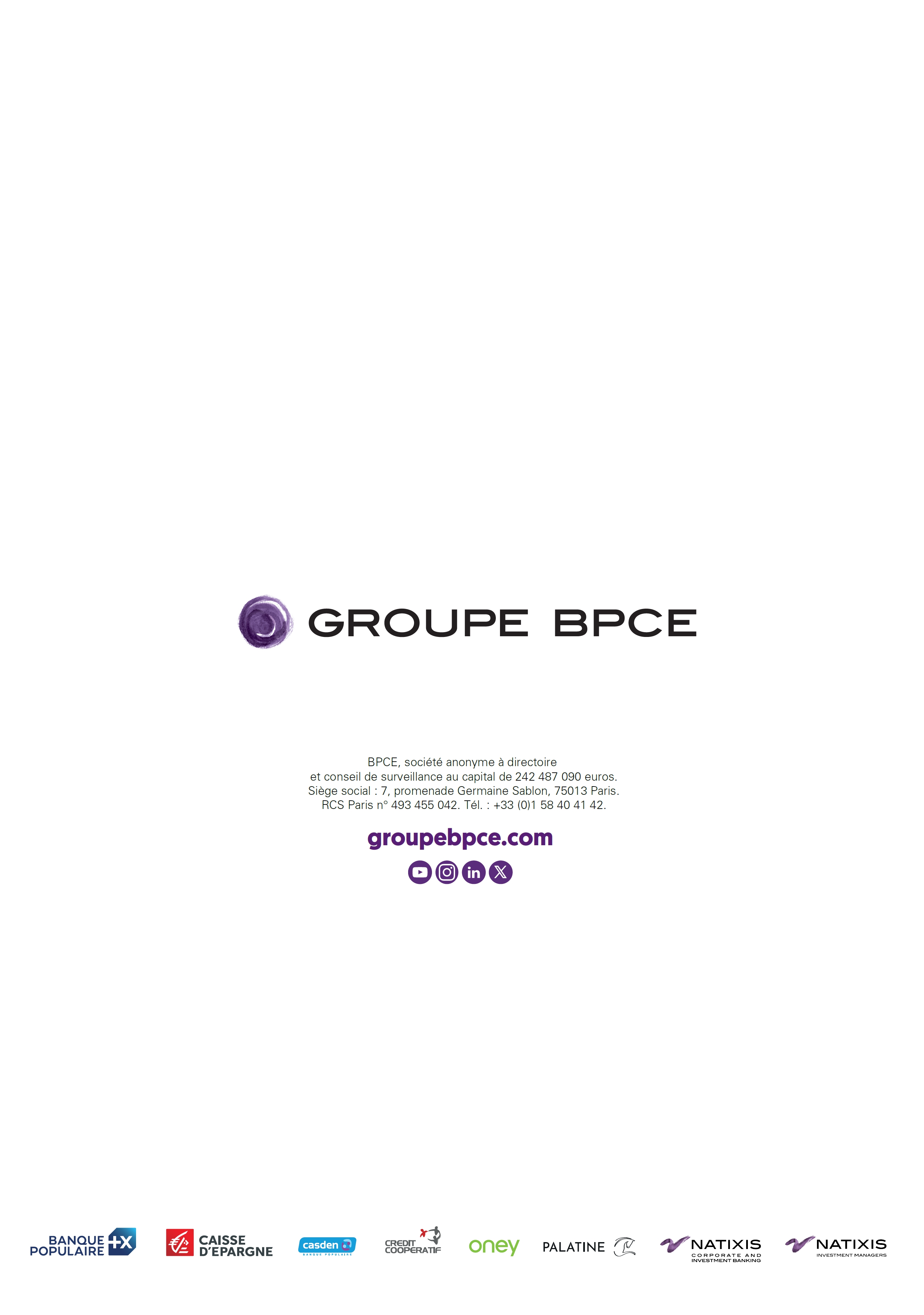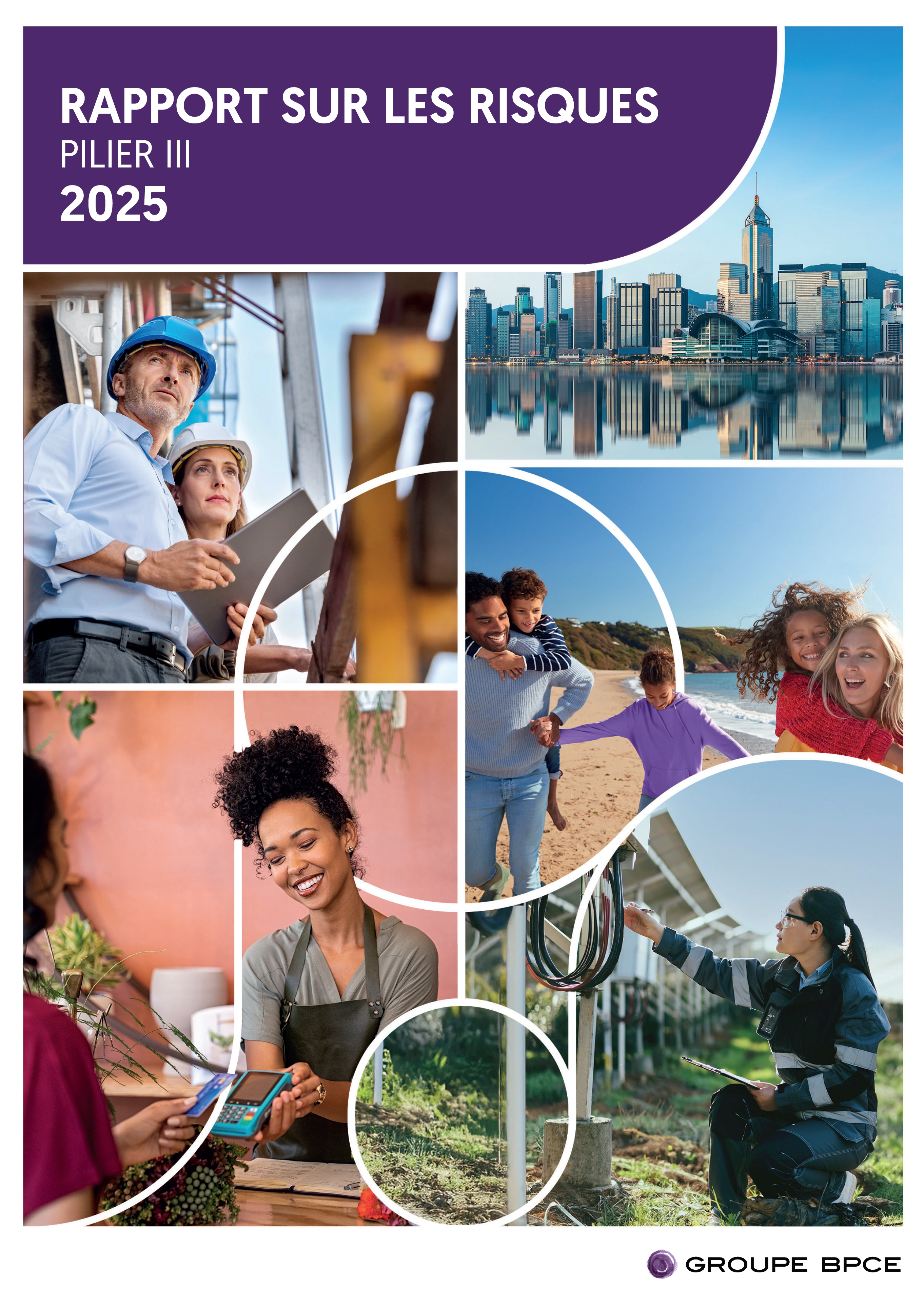 Pilier III 2025FONDS PROPRES EU KM1 Indicateurs clés 9 EU CC2 Passage du bilan comptable consolidé au bilan prudentiel 41 BPCE01 Fonds propres prudentiels phasés 45 BPCE02 Variation des fonds propres CET1 46 BPCE03 Détail des participations ne donnant pas le contrôle (intérêts minoritaires) 46 BPCE04 Variation des fonds propres AT1 47 BPCE05 Variation des fonds propres Tier 2 47 EU OV1 Vue d’ensemble des risques pondérés 48 BPCE06 Risques pondérés par type de risque et de métiers 49 EU INS1 Participations dans les entreprises d’assurance non déduites des fonds propres 49 EU CMS1 Comparaison des montants d’exposition pondérés modélisés et en approche standard au niveau du risque 49 EU CMS2 Comparaison des montants d’exposition pondérés modélisés et en standard pour le risque de crédit ventilés par classe d’actifs 50 BPCE07 Fonds propres prudentiels et ratios de solvabilité Bâle III phasé 51 EU LR1 (LRSum) Passage du bilan comptable à l’exposition de levier 52 EU LI3 Résumé des différences entre les périmètres de consolidation statutaire et prudentiel 54 EU LI1 Différences entre le périmètre de consolidation comptable et le périmètre de consolidation prudentielle et mise en correspondance des catégories des états financiers avec les catégories de risques réglementaires 68 EU LI2 Principales sources de différences entre les montants d’exposition réglementaires et les valeurs comptables des états financiers 71 EU CC1 Composition des fonds propres réglementaires 72 BPCE08 Fonds propres additionnels de catégorie 1 75 BPCE09 Émissions de titres supersubordonnés 75 BPCE10 Fonds propres de catégorie 2 75 BPCE11 Émissions de titres subordonnés 76 EU CCYB1 Répartition géographique des expositions de crédit utilisées dans le calcul du coussin de fonds propres contracyclique 77 EU CCYB2 Montant du coussin de fonds propres contracyclique 78 EU PV1 Corrections de valeur à des fins d’évaluation prudente (PVA) 79 EU LR2 (LRCom) Ratio de levier 80 EU LR3 (LRSpl) Ventilation des expositions au bilan (excepté dérivés, OFT et expositions exemptées) 82 EU INS2 Conglomérats financiers – informations sur les Fonds Propres et le ratio d’adéquation des Fonds Propres 82 EU KM2 Indicateurs clés – Ratio TLAC 82 EU TLAC1 Composition ratio TLAC 83 EU TLAC3a Rang dans la hiérarchie des créanciers – Groupe de résolution 85 RISQUE DE CRÉDIT BPCE12 Périmètre d’application des méthodes standard et IRB pour le groupe 92 BPCE13 Répartition de l’EAD par approche pour les principales catégories 92 BPCE14 Concentration par emprunteur 101 BPCE15 Couverture des encours douteux 102 EU CQ1 Qualité de crédit des expositions renégociées 103,111 EU CR1 Expositions performantes et non performantes et provisions correspondantes 104,112 EU CQ3 Qualité de crédit des expositions performantes et non performantes par nombre de jours en souffrance 106,114 EU CQ4 Qualité des expositions par zone géographique 108,116 EU CQ5 Qualité de crédit des prêts et avances accordés à des entreprises non financières par branche d’activité 109,117 EU CR3 Techniques de réduction du risque de crédit 110,118 EU CR1-A Échéance des expositions 120 EU CQ7 Sûretés obtenues par prise de possession et exécution 120 EU CR4 Approche standard – Exposition au risque de crédit et effets de l’atténuation 121 EU CR5 Approche standard – Expositions par classe d’actifs et par coefficient de pondération des risques après application des techniques d’atténuation du risque de crédit 123 EU CR6 Approche NI – Expositions au risque de crédit par catégorie d’expositions et fourchette de PD 126 EU CR6-A Champ d’application des approches NI et SA 144 EU CR7 Approche NI – Effet sur les risques pondérés des dérivés de crédit utilisés comme techniques d’atténuation du risque de crédit 146 EU CR7-A Approche NI – Informations sur le degré d’utilisation de techniques d’atténuation du risque de crédit 147 EU CR8 États des flux des risques pondérés relatifs aux expositions au risque de crédit dans le cadre de l’approche NI 149 EU CR9 Approche NI — Contrôle a posteriori des PD par catégorie d’exposition (échelle de PD fixe) 150 BPCE16 PD et LGD moyennes ventilées par zone géographique 164 BPCE17 Contrôle a posteriori des LGD par catégorie d’exposition 165 EU CR10 Expositions de financements spécialisés et sous forme d’actions faisant l’objet de la méthode de pondération simple 166 RISQUE DE CONTREPARTIE BPCE18 Répartition des expositions brutes au risque de contrepartie, par classe d’actifs (hors autres actifs) et par méthode 173 BPCE19 Répartition des risques pondérés au titre de l’ajustement de l’évaluation de crédit (CVA) par catégorie d’expositions 173 BPCE20 Valeurs exposées au risque de contrepartie sur les opérations de dérivés et pensions 174 BPCE21 Notionnel des dérivés 174 EU CVA1 Risque d’ajustement de l’évaluation de crédit selon l’approche de base réduite (R-BA) 175 EU CVA2 Risque d’ajustement de l’évaluation de crédit selon l’approche de base complète (F-BA) 175 EU CCR1 Analyse de l’exposition au risque de contrepartie par approche 176 EU CCR3 Approche standard — Expositions au risque de contrepartie par catégorie d’expositions réglementaires et pondération de risque 177 EU CCR4 Approche NI – Expositions au risque de contrepartie par catégorie d’expositions et échelle de PD 178 EU CCR5 Composition des sûretés pour les expositions au risque de contrepartie 182 EU CCR6 Expositions sur dérivés de crédit 183 EU CCR7 États des flux de risques pondérés relatifs aux expositions au risque de contrepartie dans le cadre de l’IMM 183 EU CCR8 Expositions sur contreparties centrales (CCP) 184 TITRISATION BPCE22 Répartition des encours par nature de titrisation 189 BPCE23 Répartition des EAD et risques pondérés par type de portefeu
